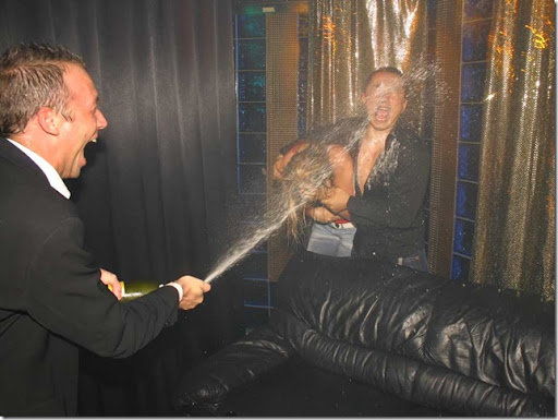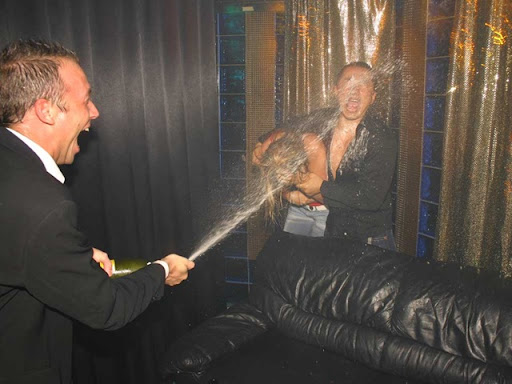 Så här ska en skumpa sprutas, på inget annat sätt. Ni ser tydligt på bilden vilken enorm fullträff jag får på min gode vän David Godvik. Unge herr Godvik har full fokus på att hålla fast det lilla ungdjuret medans jag själv tar chansen och lägger en välriktad stråla rakt in i optiken på David. Notera även min totala lycka över fullträffen, tror nästan hakpartiet är på väg att hoppa ur led. Så här kunde det alltså se ut en vanlig sommarkväll i Juni 2004. Var det inte galet så säg?
