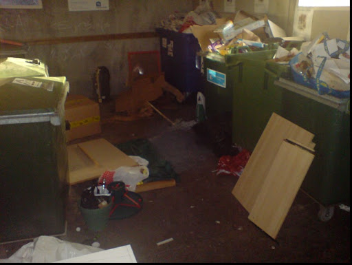 Tur att jag har bloggen att skriva av mig till när det gäller vissa saker, den här grejen fick mig dessutom att gå tillbaka för att fotografera och bevara. Dock skulle jag behöva en vidvinkellins för att få med hela förödelsen. Det handlar om våra grannar samt vår sopstation eller vad det kallas för. Antingen så har vi råttor i samma storlek som människor/apor som tar sig in på sopstationen med Aptusbricka, ni vet en sådan där som man har istället för nyckel. Andra alternativet är att det är människor/apor som kommer med sitt skräp, öppnar dörren till sopstationen och kastar in sitt skräp. Detta gäller oavsett om det är en soppåse fylld med matrester eller om det är en gammal bokhylla som ska slängas. ALLT slängs bara rakt in, trots att det finns sopkärl för soporna.