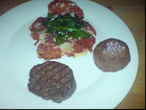 Middagen hos David igår var supertrevlig. Maten var superb, hade förvisso inte förväntat mig mindre. David hade slagit på stort, körde en grymt god hummersoppa till förrätt. Det mest intressanta var dock varmrätten, som hade oxfilé som röd tråd. Här bjöds det på oxfilé på tre olika vis. En vanlig ugnsstekt oxfilé, steak tartar (alltså råbiff på mald oxfilé) samt carpaccio (utbankad rå oxfilé). Allt detta var så jäkla gott. Modigast var dock Josephine som faktiskt provade allting... Hon som vill ha köttet vidbränt nästan och här talar vi RÅ oxfilé!